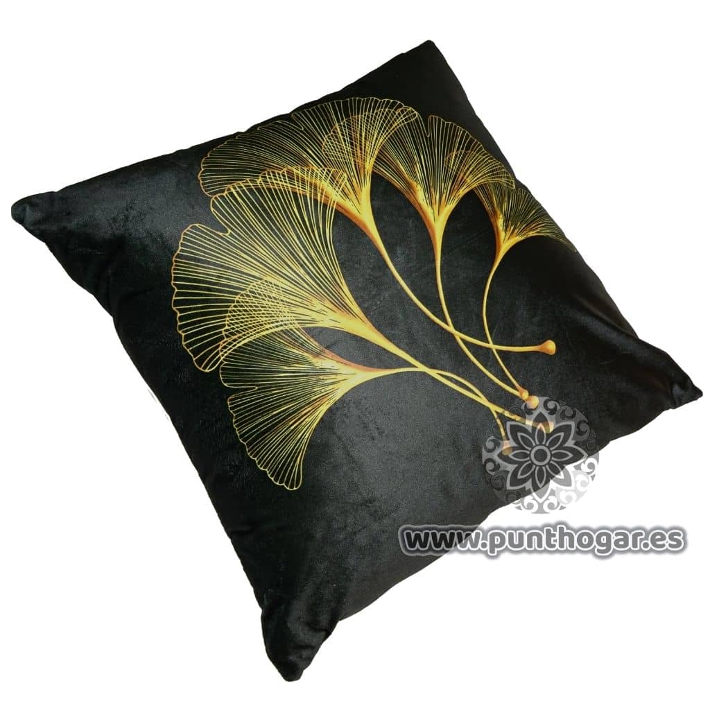 Cojín con estampado de flores petunias en tonos oro sobre fondo negro perfecto para la decoración de la casa, ya sea del salón o de un dormitorio.