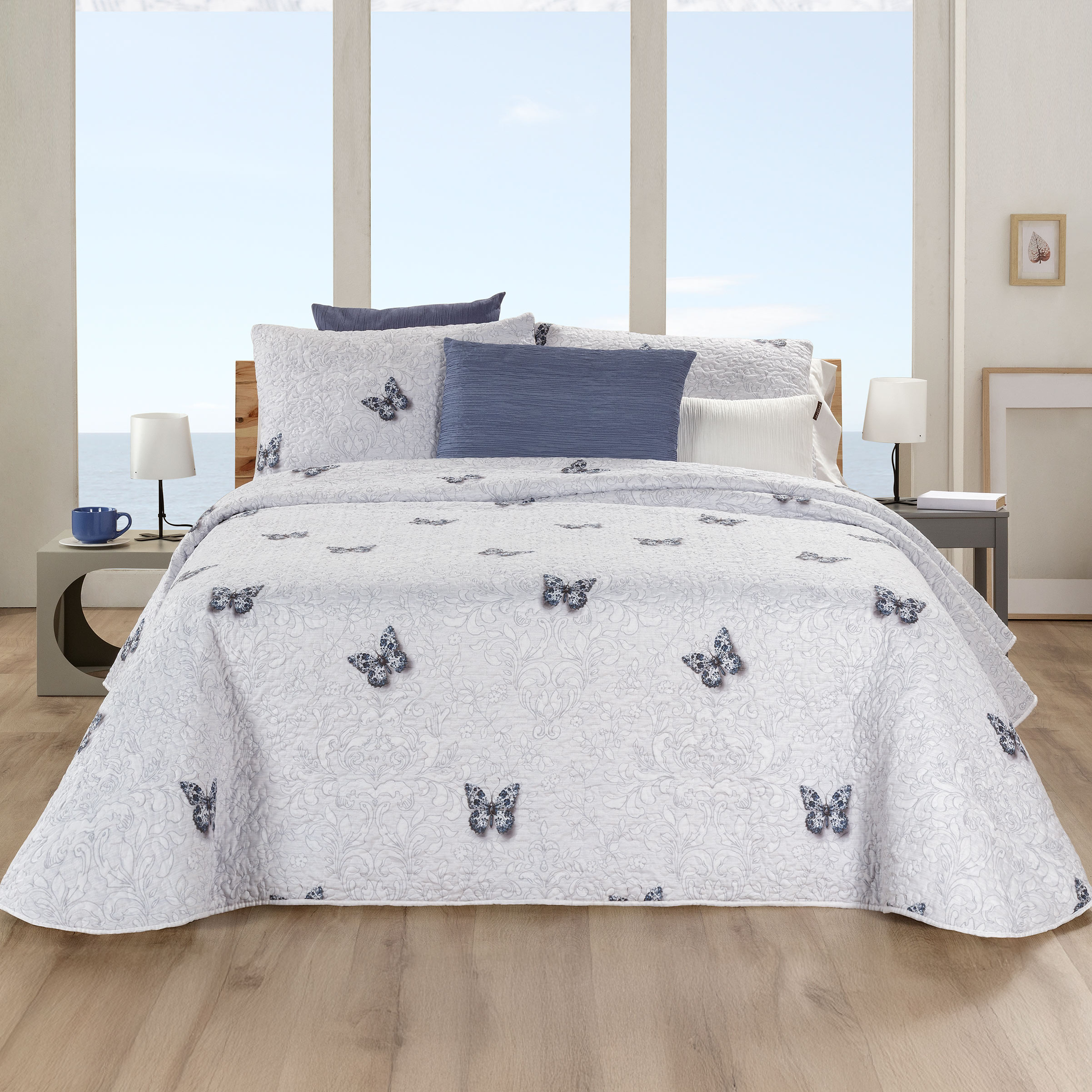 Esta colcha ha sido especialmente diseñada para adaptarse a la frescura del verano y a la suavidad de los meses de entretiempo, ofreciendo dos caras una de ellas con un estampado de mariposas en azul cobalto sobre fondo blanco y el reverso estampado floral de inspiración protuguesa en los mismos tonos, dos diseños distintivos para transformar el ambiente del dormitorio con un simple gesto.