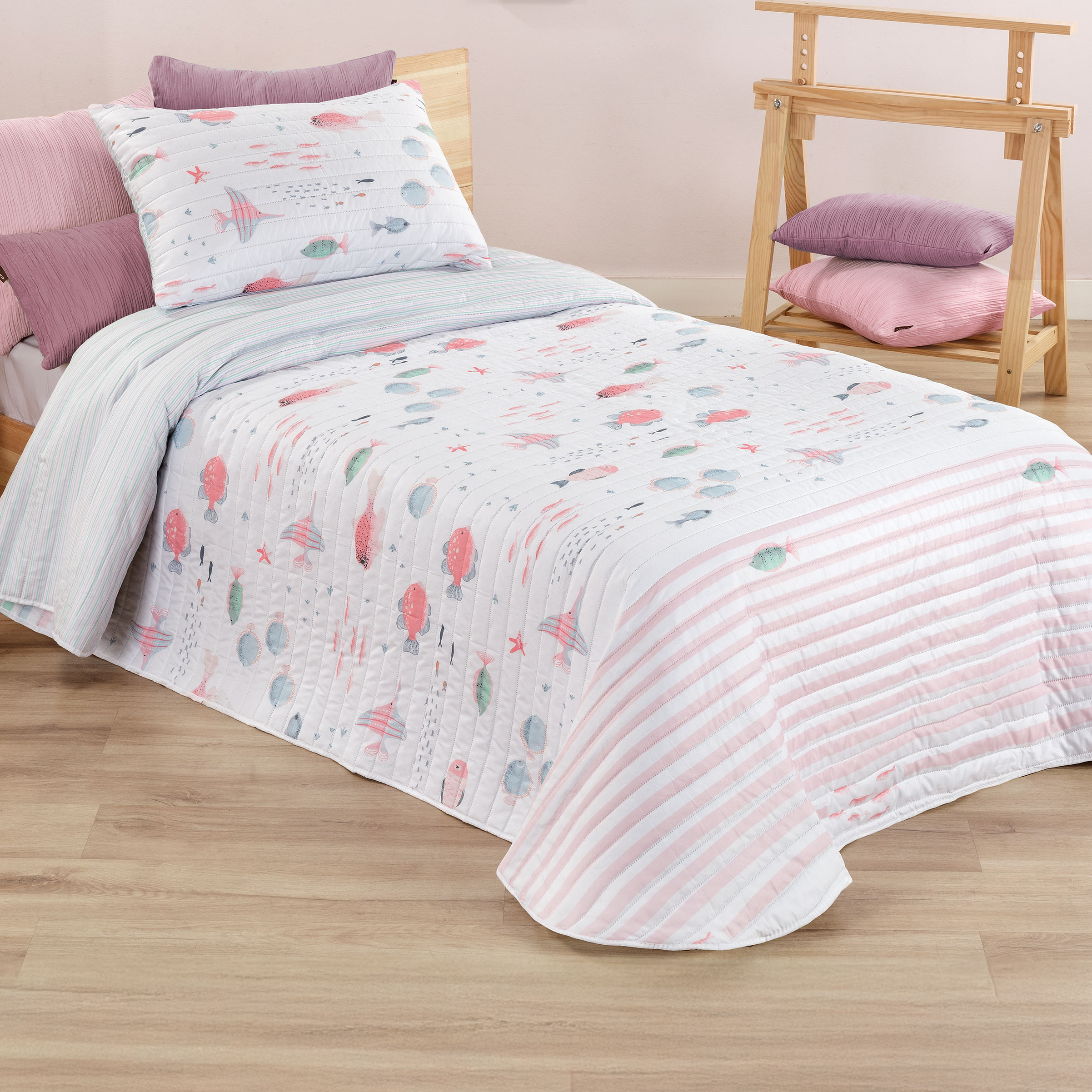 ✔ Modelo Peces 609 este es el nombre del diseño de la colcha, que presenta un estampado de peces predominando el color rosa de distintas especies en el fondo del mar.