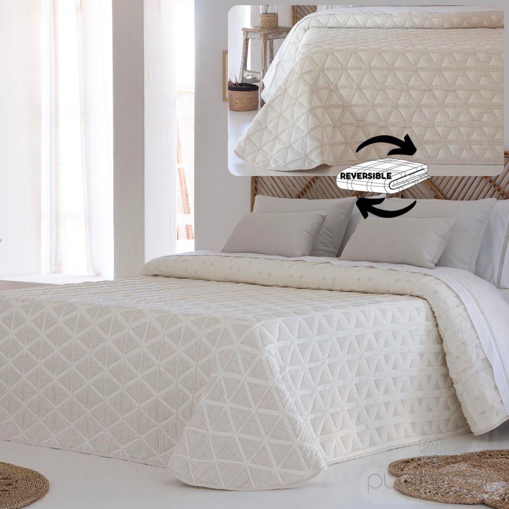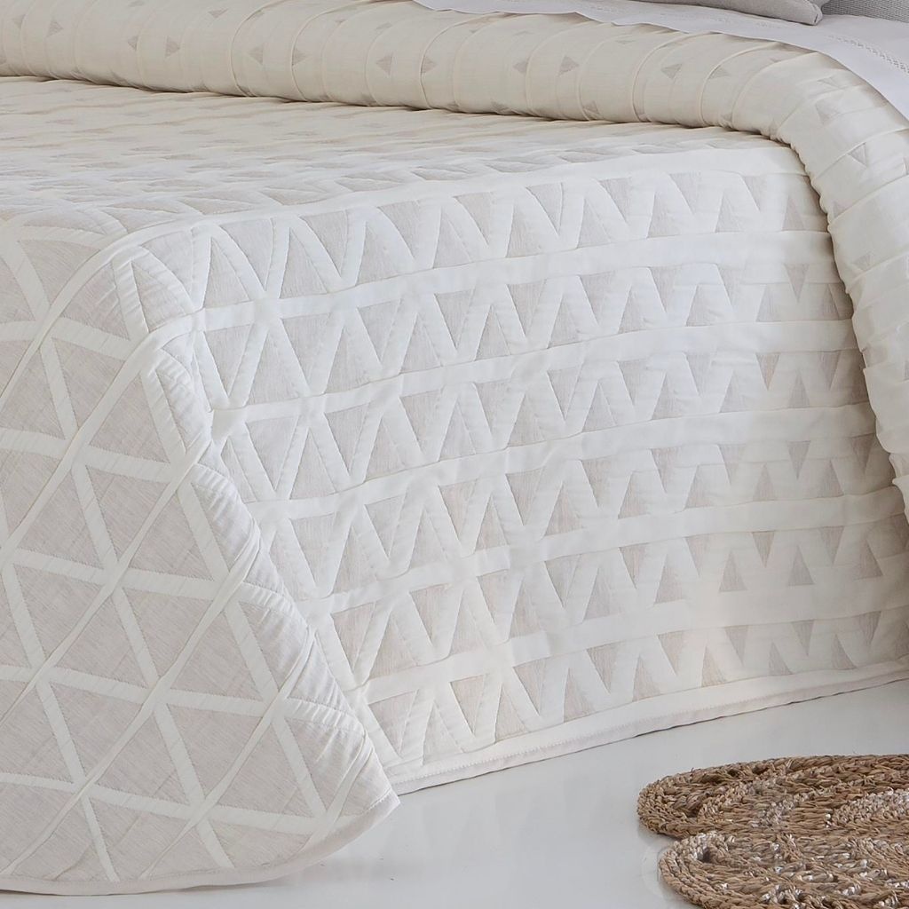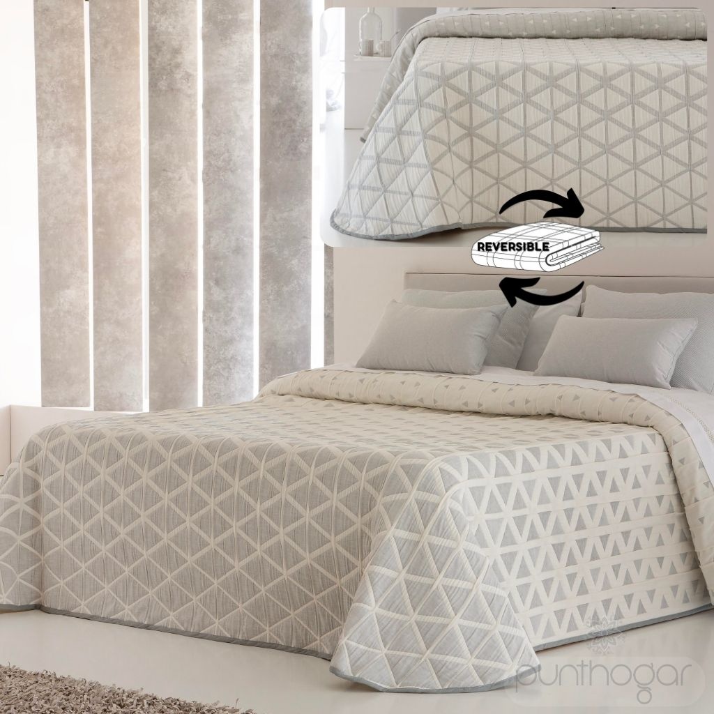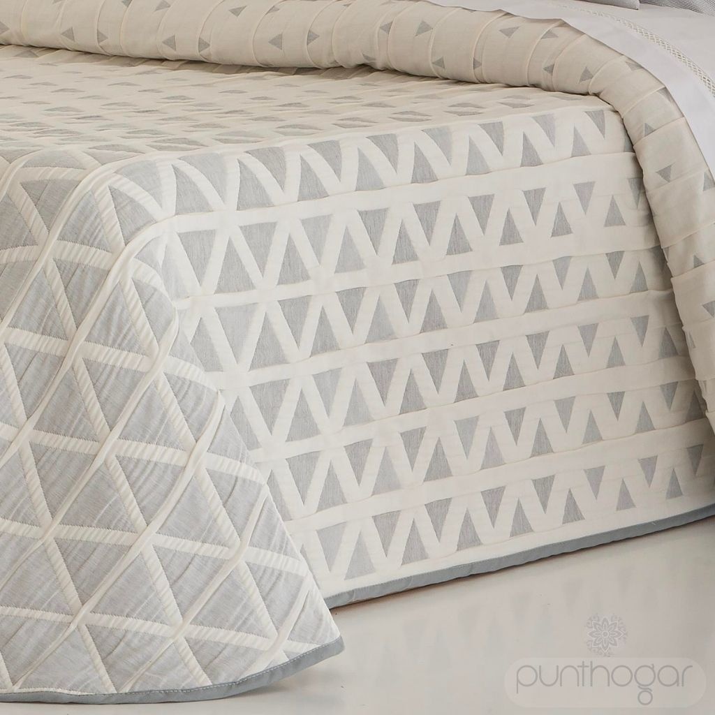 Esta colcha cubrecama destaca por su diseño geométrico de triángulos entrelazados que se van reduciendo en tamaño progresivamente hacia la parte del cabecero, creando un efecto visual dinámico y elegante. Este detalle, junto con su textura piqué y colores neutros (beis o gris), aporta un estilo moderno y sofisticado al dormitorio.
