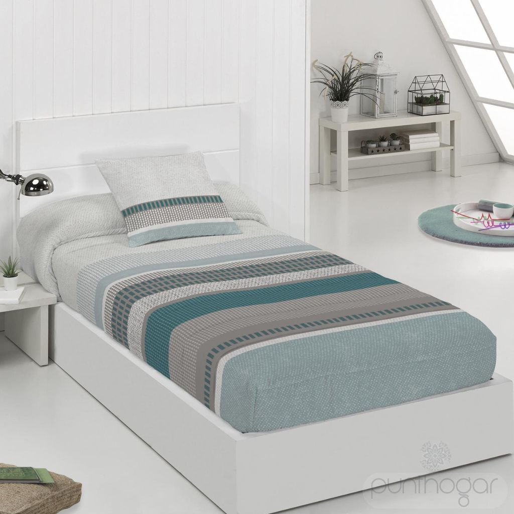 Estampado digital geométrico con franjas de diferentes colores de colorido y diseño acogedor siguiendo patrones de moda actual, fácil de combinar en la habitación. Válido para camas de 190 y 200 de largo y colchones de hasta 28 cm de altura.