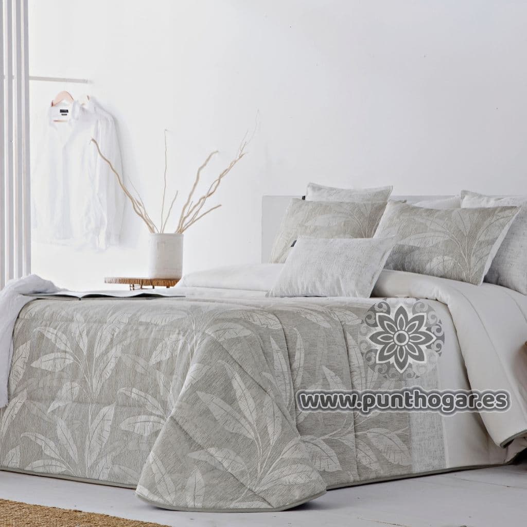 Lo puede elegir en color gris e incluye 2 fundas de cojín de 70x50cms a tono con el edredón. Fundas con 2 caras y cierre mediante cremallera. La cara principal de hojas y la cara secundaria en tejido liso, a juego con el edredón .