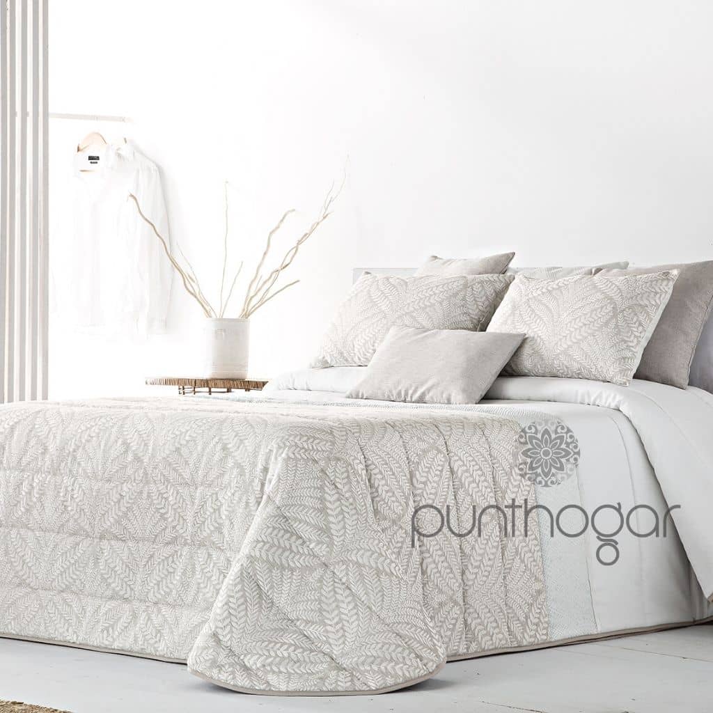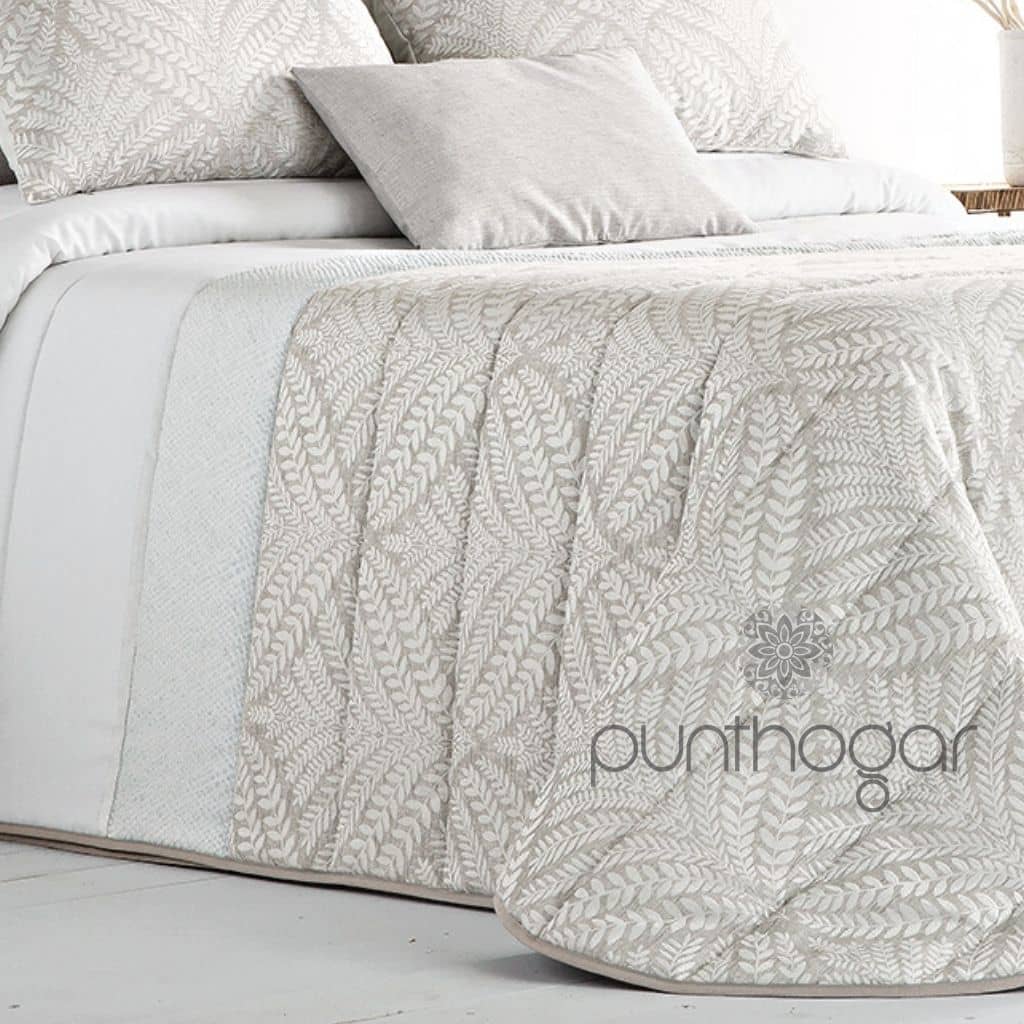Lo puede elegir en color beis grisáceo e incluye 2 fundas de cojín de 70x50cms a tono con el edredón. Fundas con 2 caras y cierre mediante cremallera. La cara principal de hojas y la cara secundaria en tejido liso, a juego con el edredón.