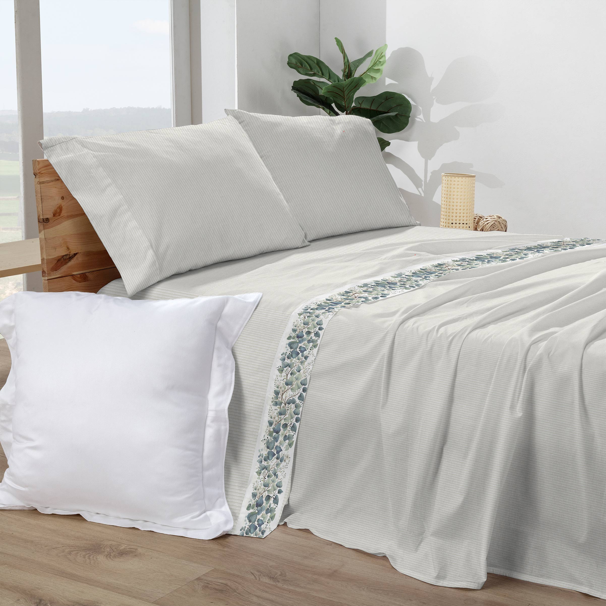 De estilo elegante y confortable para quienes buscan renovar su dormitorio con un toque de originalidad. Confeccionado en una equilibrada mezcla de 50% algodón y 50% poliéster, este set combina la suavidad natural del algodón con la durabilidad y facilidad de mantenimiento del poliéster. Su diseño elegante de la sábana encimera con fondo de listas con forma espiral que la complementa una bonita cenefa de hojas de hiedra en tonos azules y con la sábana bajera combinada que aporta elegancia a cualquier estancia.