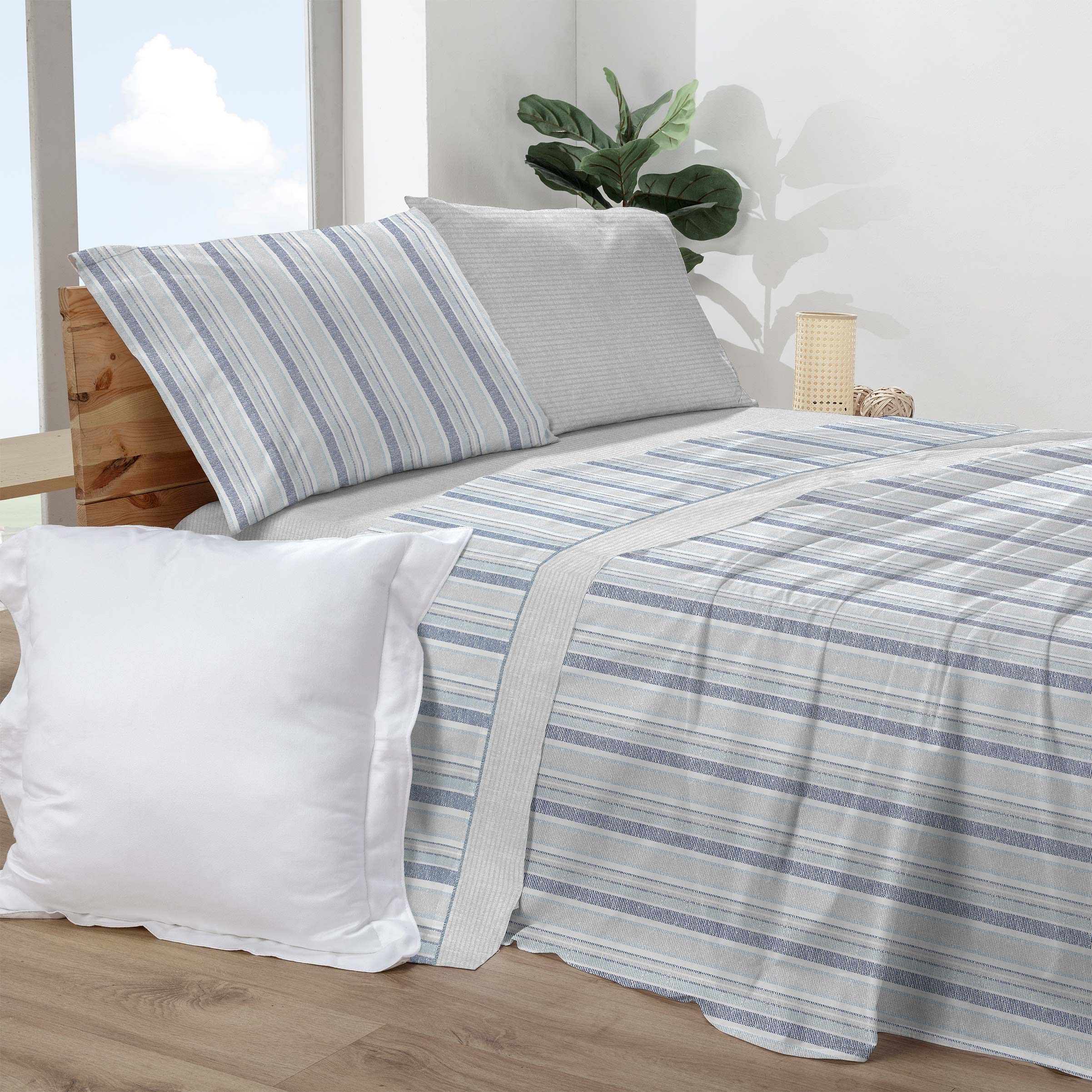 Son una propuesta de estilo moderno y confortable para quienes buscan renovar su dormitorio con un toque de originalidad. Confeccionado en una equilibrada mezcla de 50% algodón y 50% poliéster, este set combina la suavidad natural del algodón con la durabilidad y facilidad de mantenimiento del poliéster. Su diseño elegante de la sábana encimera con listas anchas en tonos gris y azul y con la sábana bajera combinada en listas finas en los mismos tonos aportando elegancia y diseño a cualquier estancia.