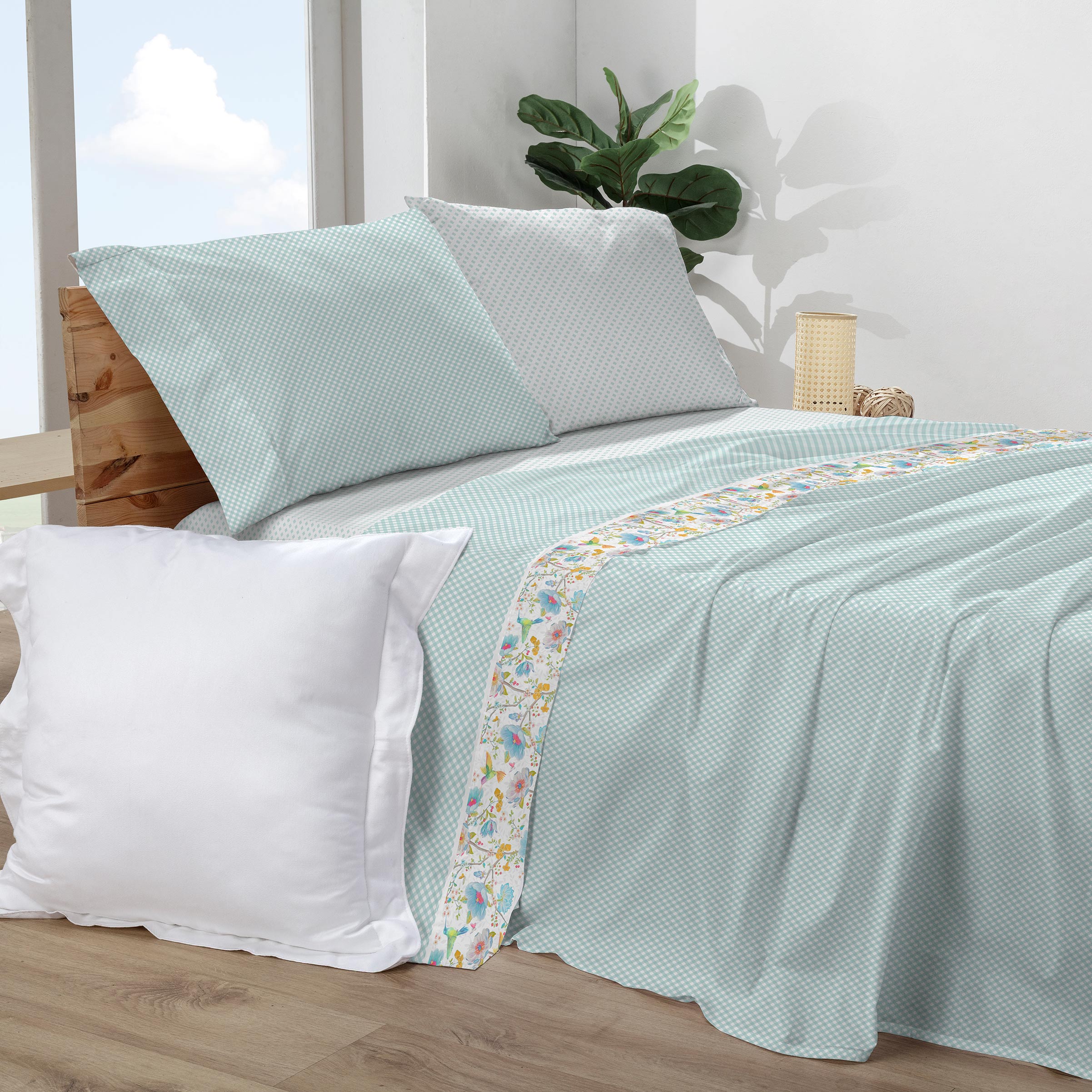 Son una propuesta de estilo moderno y confortable para quienes buscan renovar su dormitorio con un toque de originalidad. Confeccionado en una equilibrada mezcla de 50% algodón y 50% poliéster, este set combina la suavidad natural del algodón con la durabilidad y facilidad de mantenimiento del poliéster. Su diseño vibrante incluye un fondo de cuadros vichy en diagonal color verde con una cenefa floral con pájaros, la sábana bajera va combinada en los mismos cuadros verdes con fondo blanco aportando frescura y un aire primaveral a cualquier estancia.