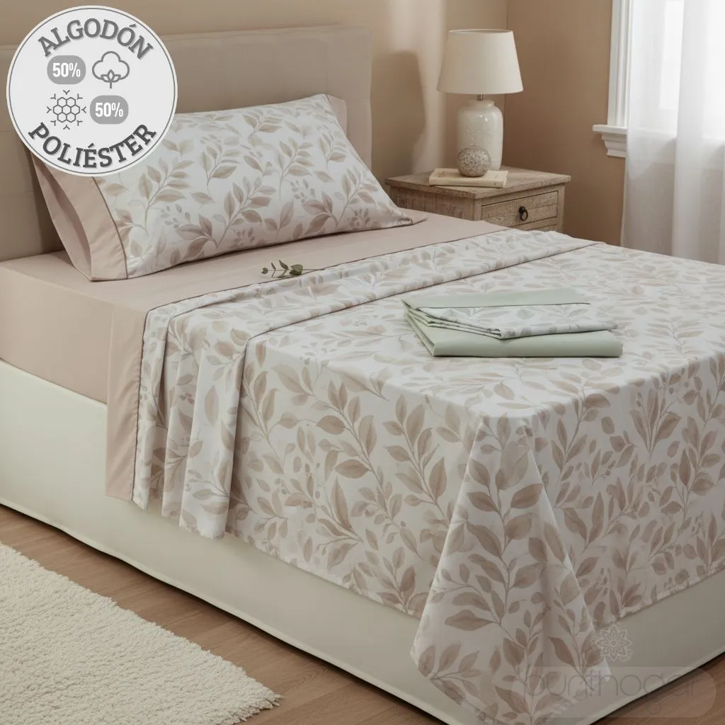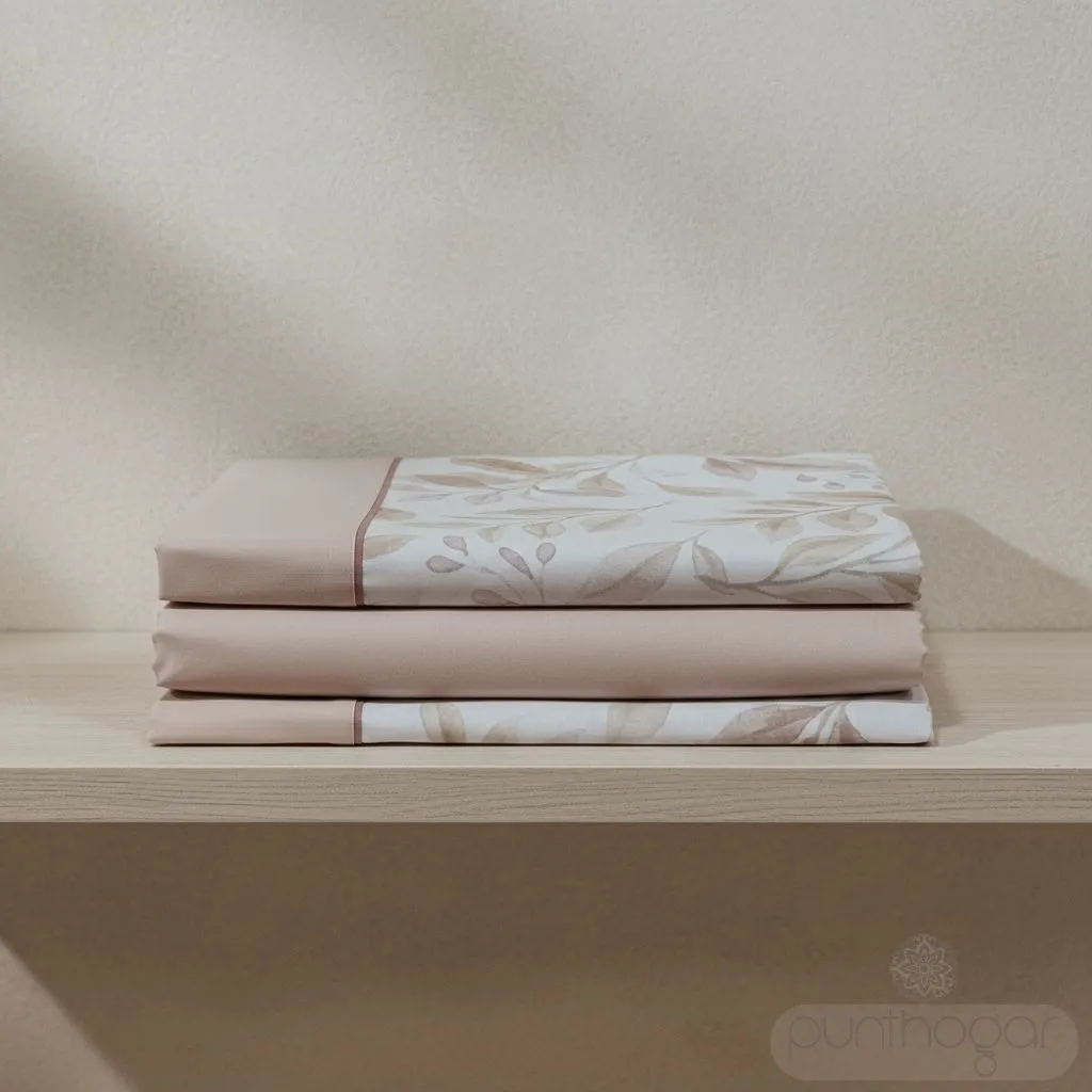 No esperes más para disfrutar del diseño botánico y la suavidad del juego de sábanas Casa Campo TEMO en colores nude y verde.