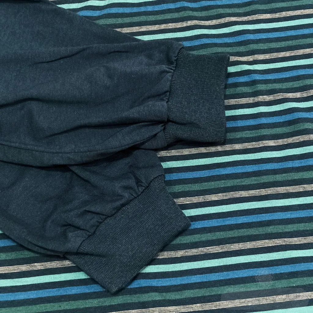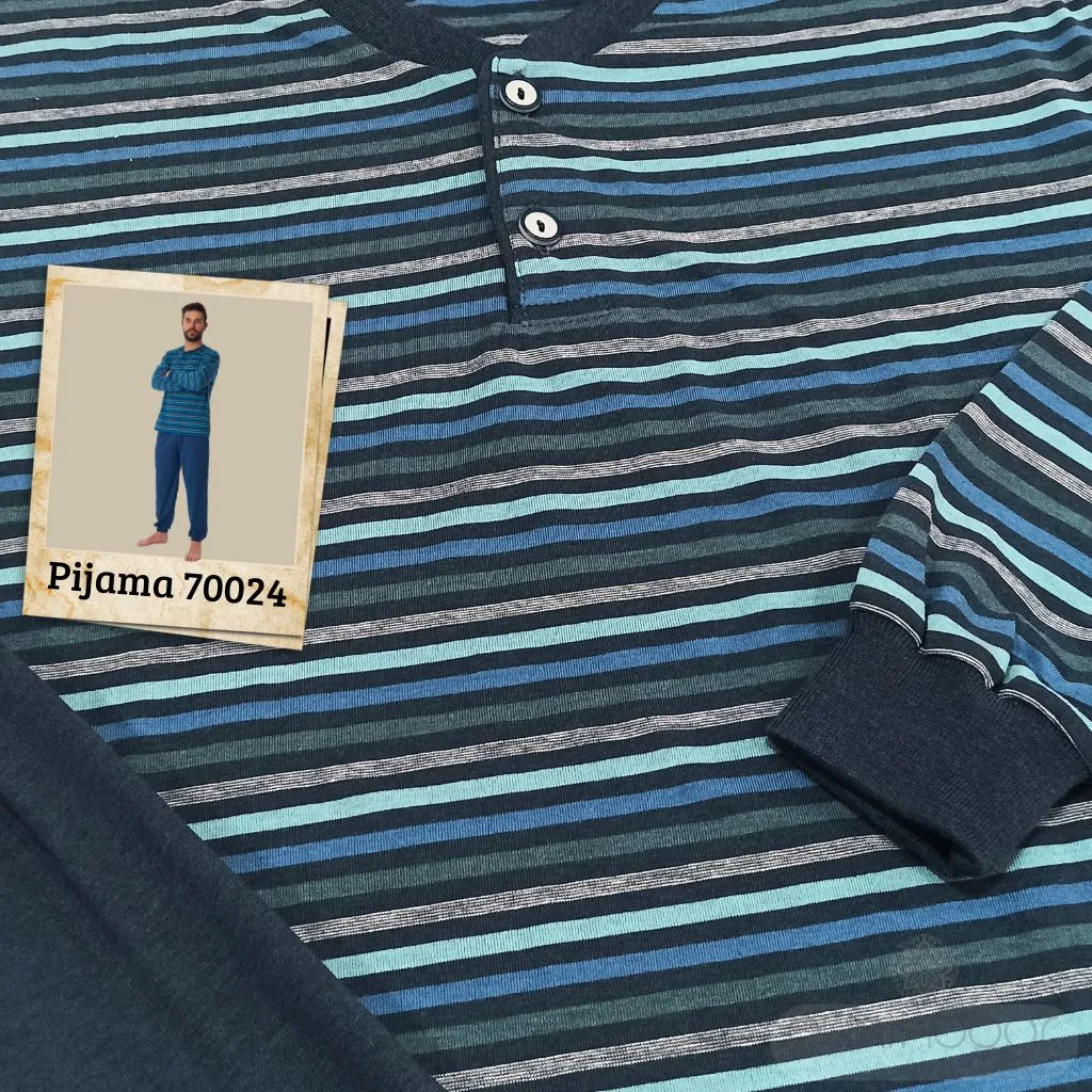 Descubre el equilibrio perfecto entre confort, frescura y diseño moderno con el pijama para hombre modelo 70024 de Dormen, confeccionado íntegramente en algodón 100% natural. Este pijama es la opción perfecta para quienes buscan confort, transpirabilidad y estilo. Confeccionado en España, este pijama largo combina una camiseta de manga larga con diseño de rayas en tonos azules, cuello con botones y puño en las mangas, junto con un pantalón liso azul petróleo con cintura elástica y puños en los bajos.