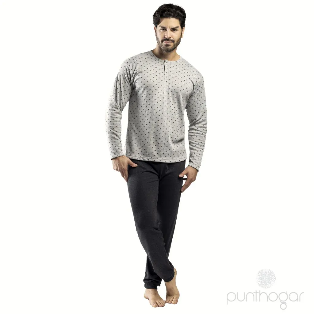 Este conjunto incluye una camiseta de manga larga con cuello redondo y cierre con tapeta de tres botones, que facilita ponérselo y aporta un toque moderno, junto con pantalones largos de cintura elástica y puños elásticos para un ajuste seguro y cómodo. El diseño en gris claro con pequeños motivos geométricos en rojo combina elegancia discreta con un aire contemporáneo, ideal para hombres que buscan estilo incluso en su ropa de dormir. Su corte regular y líneas limpias resaltan la calidad del tejido interlock perchado, dando un acabado pulido y natural a la prenda.